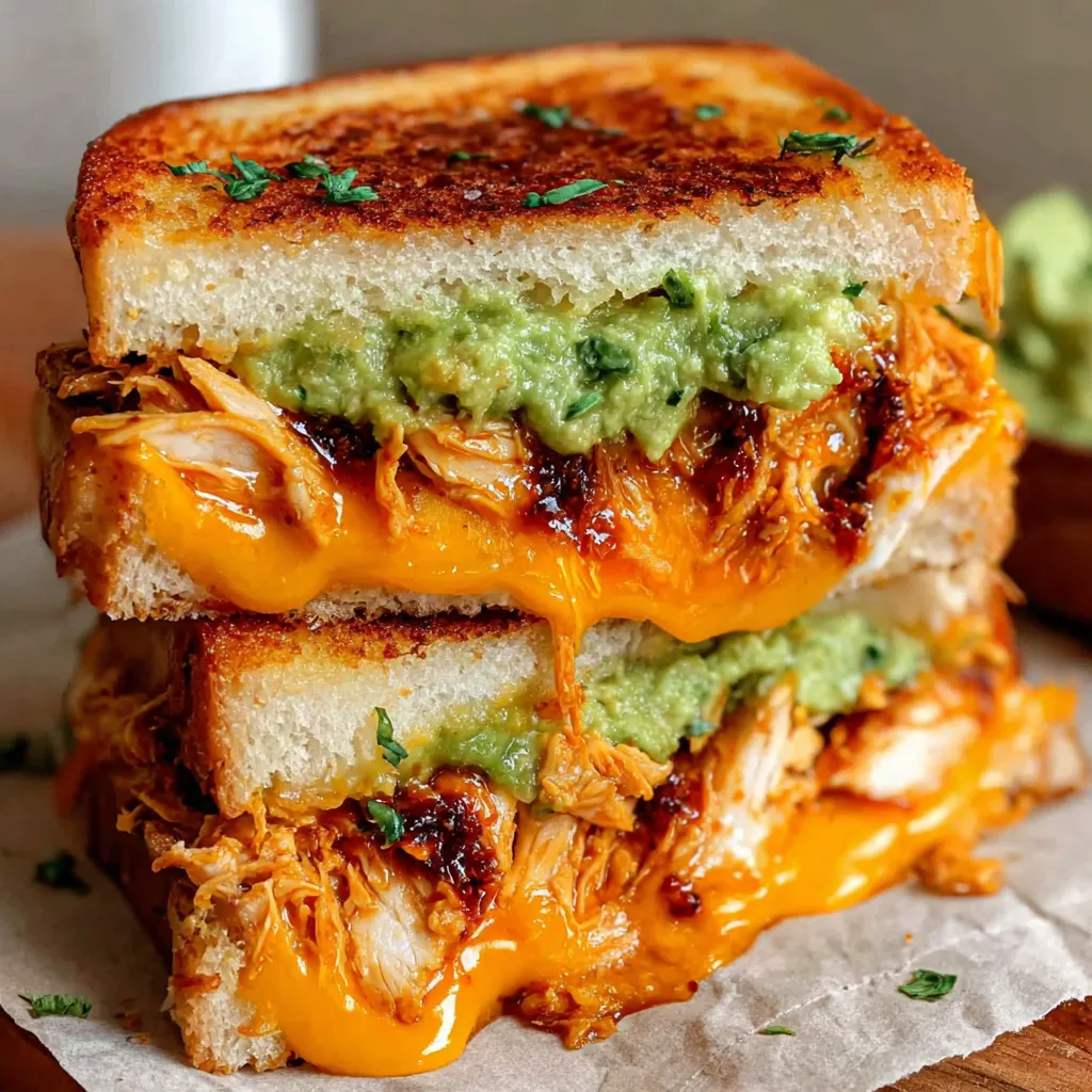 10. Serve: Slice the sandwiches in half and serve immediately. Enjoy the crispy bread, melty cheese, flavorful chicken, and creamy avocado goodness!